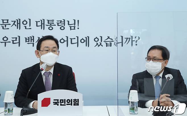 (서울=뉴스1) 신웅수 기자 = 주호영 국민의힘 원내대표(왼쪽)가 6일 오후 서울 여의도 국회를 찾은 유영민 신임 대통령 비서실장과 환담을 나누고 있다. 2021.1.6/뉴스1