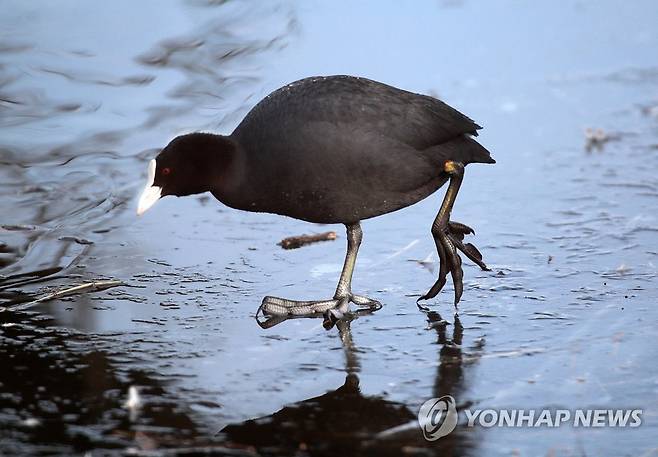 (창원=연합뉴스) 지난 3일 물닭이 경남 창원시 의창구 동읍 주남저수지에서 먹이를 찾고 있다. 2021.1.6 [최종수 생태사진가 제공. 재판매 및 DB 금지]