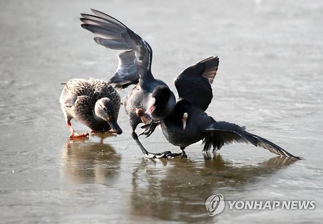 (창원=연합뉴스) 지난 3일 물닭이 경남 창원시 의창구 동읍 주남저수지에서 먹이를 찾고 있다. 2021.1.6 [최종수 생태사진가 제공. 재판매 및 DB 금지]