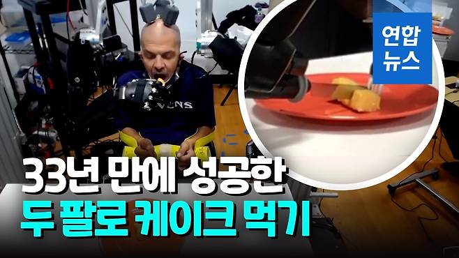 (서울=연합뉴스) 33년 전 사고로 사지가 마비된 미국 남성이 자신의 뇌파로 로봇팔을 움직여 케이크를 먹는 데 성공했습니다.