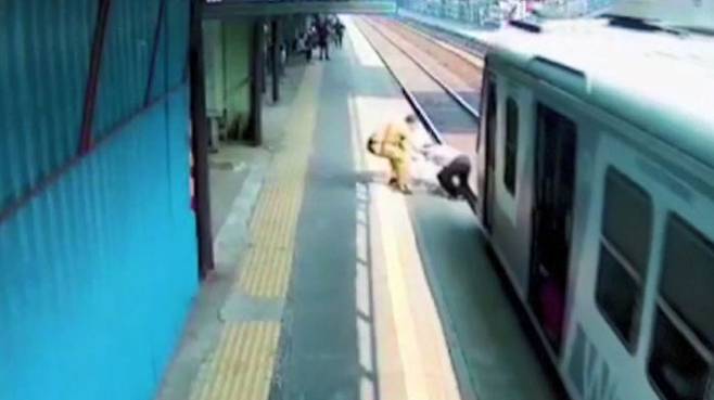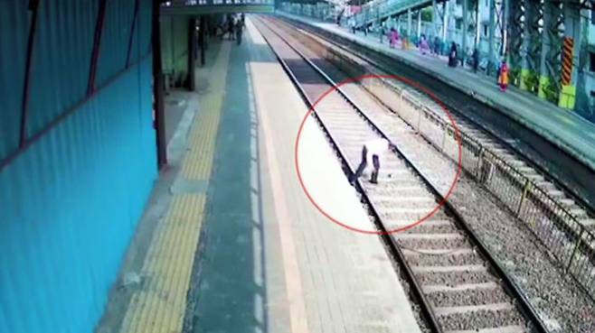 인도 뭄바이의 한 기차역입니다. 누군가 갑자기 선로로 뛰어듭니다.