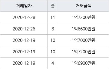 국토교통부 실거래가 공개시스템에 따르면 지난 2020년 12월 19일 인천광역시 연수구 연수동 인천연수1 4층 전용면적 49㎡형이 1억6900만원에 거래됐다. 지난 2020년 12월 28일 같은 면적형인 11층 물건이 1억7200만원에 실거래된 것과 비교해 300만원 낮은 가격이다.