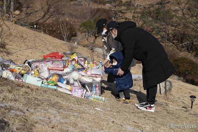 | ▲ 양부모 학대로 사망한 생후 16개월 정인이가 잠들어 있는 경기도 양평군 서종면 하이패밀리 안데르센 자연묘지에서 5일 오전 정인이와 또래인 아이와 함께 부모가 참배하고 있다. |