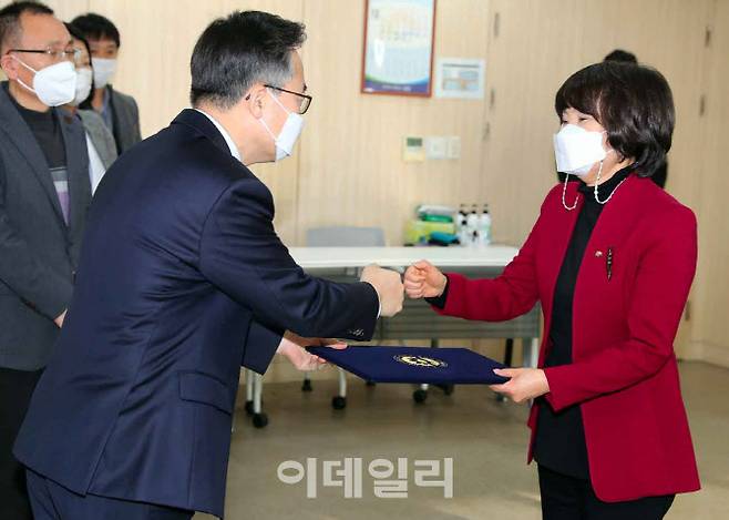 [이데일리 김태형 기자] 유성훈 금천구청장이 지난 12월 김미희 복지가족국장에게 임용장을 전달하며 주먹인사를 나누고 있다.
