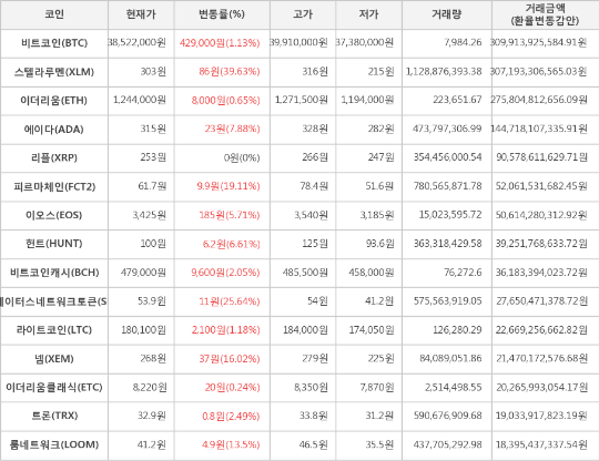 또한, 스테이터스네트워크토큰(25.64%, 53.9원), 피르마체인(19.11%, 61.7원), 넴(16.02%, 268원), 룸네트워크(13.5%, 41.2원), 에이다(7.88%, 315원), 헌트(6.61%, 100원), 이오스(5.71%, 3,425원), 트론(2.49%, 32.9원), 비트코인캐시(2.05%, 479,000원), 라이트코인(1.18%, 180,100원), 이더리움(0.65%, 1,244,000원), 이더리움클래식(0.24%, 8,220원)이 상승세를 나타냈다.