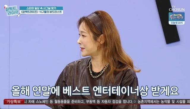 뒤이어 현영은 “지난 연말에 류수영, 홍경민이 베스트 엔터테이너상을 받았다. 축하드리고. 그래서 저는 올해를 그 해로 정하고 싶다. 베스트 엔터테이너상을 받고 싶다”고 새해 바람을 말했다. (사진=TV조선 ‘퍼펙트라이프’ 캡처)