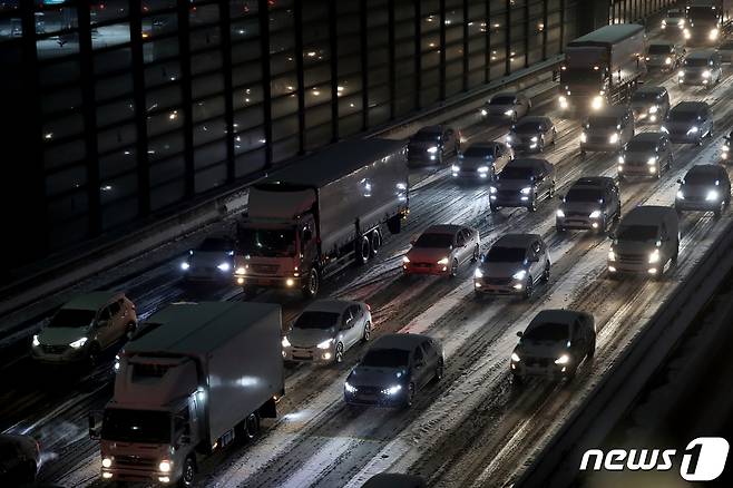 (시흥=뉴스1) 정진욱 기자 = 북극발 찬공기 영향으로 중부지역과 내륙을 중심으로 한파가 이어지고 있는 6일 경기 시흥시 서울외곽순환도로에 눈이 쌓여 퇴근길 차량들이 거북이 주행을 하고 있다. 기상청 관계자는 "서울을 포함한 수도권은 퇴근시각이 눈이 내리는 때와 겹치면서 빙판길로 인한 차량지체 심할수 있으니 유의할 것"을 당부했다. 2021.1.6/뉴스1