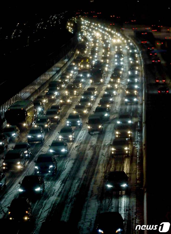 (시흥=뉴스1) 정진욱 기자 = 북극발 찬공기 영향으로 중부지역과 내륙을 중심으로 한파가 이어지고 있는 6일 경기 시흥시 수도권 제1순환고속도로에 눈이 쌓여 퇴근길 차량들이 거북이 주행을 하고 있다. 기상청 관계자는 "서울을 포함한 수도권은 퇴근시각이 눈이 내리는 때와 겹치면서 빙판길로 인한 차량지체 심할수 있으니 유의할 것"을 당부했다. 2021.1.6/뉴스1