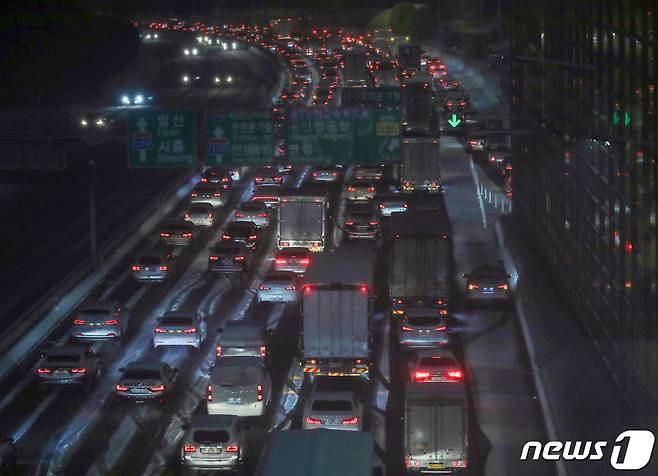 (시흥=뉴스1) 정진욱 기자 = 북극발 찬공기 영향으로 중부지역과 내륙을 중심으로 한파가 이어지고 있는 6일 경기 시흥시 수도권 제1순환고속도로에 눈이 쌓여 퇴근길 차량들이 거북이 주행을 하고 있다. 기상청 관계자는 "서울을 포함한 수도권은 퇴근시각이 눈이 내리는 때와 겹치면서 빙판길로 인한 차량지체 심할수 있으니 유의할 것"을 당부했다. 2021.1.6/뉴스1
