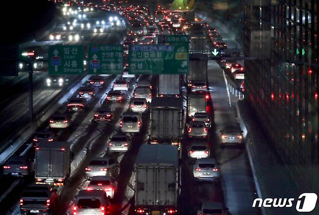 (시흥=뉴스1) 정진욱 기자 = 북극발 찬공기 영향으로 중부지역과 내륙을 중심으로 한파가 이어지고 있는 6일 경기 시흥시 수도권 제1순환고속도로에 눈이 쌓여 퇴근길 차량들이 거북이 주행을 하고 있다. 기상청 관계자는 "서울을 포함한 수도권은 퇴근시각이 눈이 내리는 때와 겹치면서 빙판길로 인한 차량지체 심할수 있으니 유의할 것"을 당부했다. 2021.1.6/뉴스1