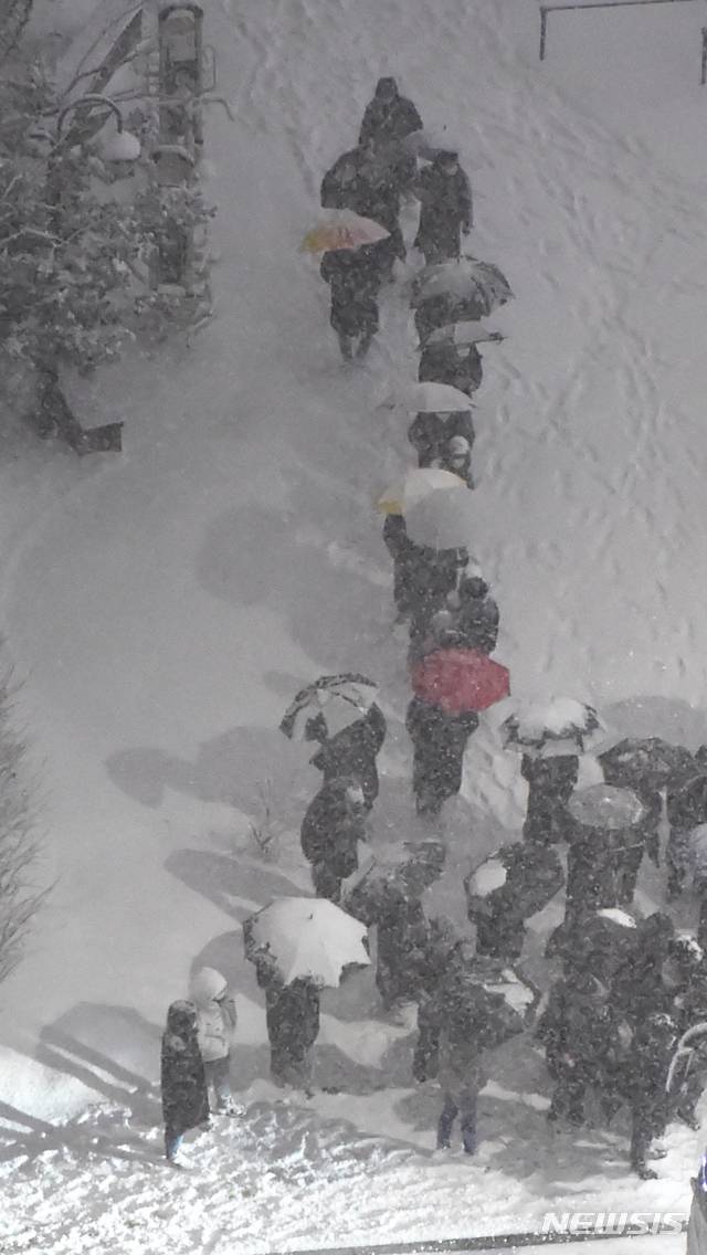 [수원=뉴시스] 김종택기자 = 수도권 지역에 대설주의보가 발효된 6일 저녁 경기도 수원시 영통구 망포동에서 퇴근길 시민들이 버스를 기다리고 있다. 2021.01.06.