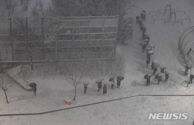 [수원=뉴시스] 김종택기자 = 수도권 지역에 대설주의보가 발효된 6일 저녁 경기도 수원시 영통구 망포동에서 퇴근길 시민들이 버스를 기다리고 있다. 2021.01.06.