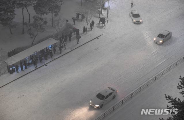 [수원=뉴시스] 김종택기자 = 수도권 지역에 대설주의보가 발효된 6일 저녁 경기도 수원시 영통구 망포동에서 퇴근길 시민들이 버스를 기다리고 있다. 2021.01.06.