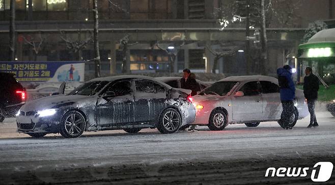 (서울=뉴스1) 이동해 기자 = 서울 전역에 대설주의보가 발효된 6일 오후 서울 잠실역 인근에서 차량 2대가 추돌사고가 발생, 빙판길 위에 차들이 멈춰서 있다. 2020.1.6/뉴스1