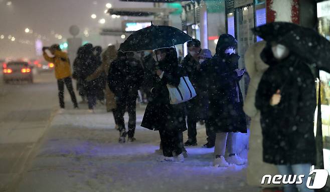 (서울=뉴스1) 이동해 기자 = 서울 전역에 대설주의보가 발효된 6일 오후 서울 잠실역 인근에서 시민들이 버스를 기다리고 있다. 2020.1.6/뉴스1