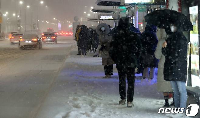 (서울=뉴스1) 이동해 기자 = 서울 전역에 대설주의보가 발효된 6일 오후 서울 잠실역 인근에서 시민들이 버스를 기다리고 있다. 2020.1.6/뉴스1