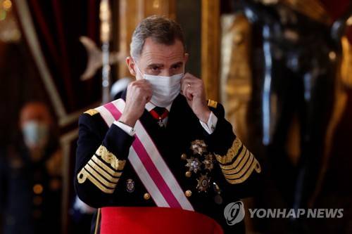 epa08922054 Spain's King Felipe VI puts on a mask during the so called 'Pascua Militar', a military celebration of Epiphany Day, at the Royal Palace in Madrid, Spain, 06 January 2021. The Pascua Militar is held every year on Epiphany Day since the 18th century to celebrate the reconquest of Menorca from the British Empire back in 1782. EPA/J. J. GUILLEN / POOL
