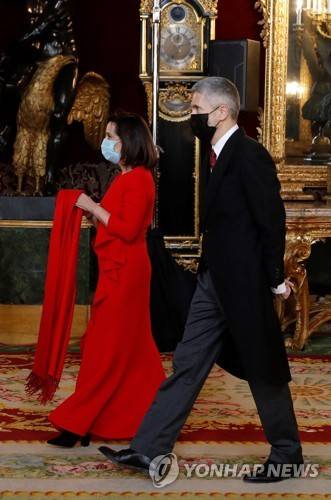 epa08922064 Spanish Home Minister Fernando Grande-Marlaska (R) and Spanish Minister of Defence Margarita Robles (L) take part the so called 'Pascua Militar', a military celebration of Epiphany Day, at the Royal Palace in Madrid, Spain, 06 January 2021. The Pascua Militar is held every year on Epiphany Day since the 18th century to celebrate the reconquest of Menorca from the British Empire back in 1782. EPA/J. J. GUILLEN / POOL