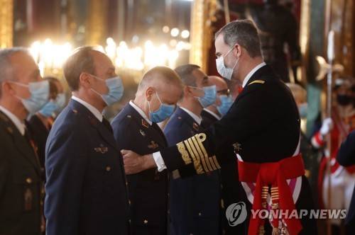 epa08922117 Spain's King Felipe VI (R) attends the so called 'Pascua Militar', a military celebration of Epiphany Day, at the Royal Palace in Madrid, Spain, 06 January 2021. The Pascua Militar is held every year on Epiphany Day since the 18th century to celebrate the reconquest of Menorca from the British Empire back in 1782. EPA/J. J. GUILLEN / POOL