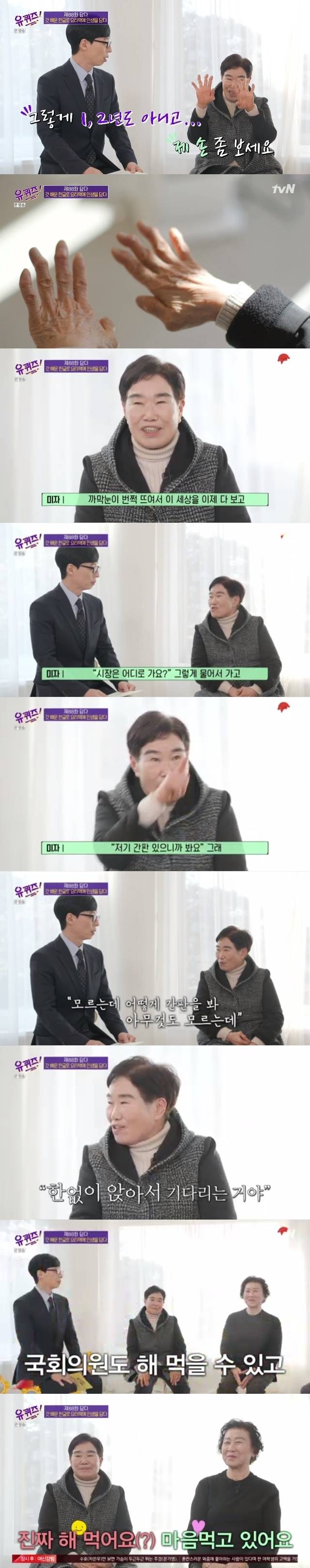 이날 주미자 작가는 지금 공부하는 사람들에게 "가끔은 내 맘을 나도 모른다. 나도 속아 넘어가기도 한다"며 "나한테 시간 가는 게 너무 아깝다"고 말했다. 자신에게 속지 말고 시간을 허투루 쓰지 말라는 교훈이었다. 그리고 이유자 작가는 하고 싶은 일이 너무 많다며, 깜짝 국회의원 출마 의사를 밝혀 웃음을 주기도 했다. (사진=tvN '유 퀴즈 온 더 블럭' 캡처)