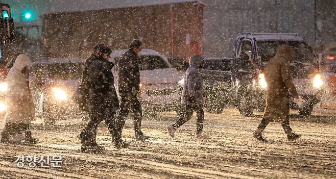 서울을 비롯한 수도권 전역에 대설주의보가 발효된 6일 밤 세종로에서 시민들이 눈을 맞으며 길을 건너고 있다. 이날 전국 곳곳에 대설·한파·강풍 특보가 발령됐다. 제주에는 사상 처음으로 한파경보가 내려졌다. 8일까지 내륙과 산지에 10~50㎝의 눈이 쌓이고 매서운 추위가 이어질 것으로 기상청은 내다봤다.