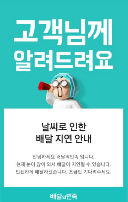 배민은 6일 저녁 '날씨로 인한 배달 지연 안내'를 공지했다. 배달이 가능한 가게들도 배달 임시 중지 등을 공지했다. 밀키트와 생필품 등을 판매하는 'B마트' 서비스는 '눈이 많이 와서 배달이 어려워요'라고 공지하고 서비스를 임시 중단했다. 배민은 자체 배달 노동자(라이더)들에게도 "기상 악화에 대비해 방한장비를 갖추고, 눈길 운행시 안전에 더욱 유의하시기 바란다"면서 "배민라이더스는 배달시간 준수와 관련한 어떠한 불이익도 없다"고 공지했다.