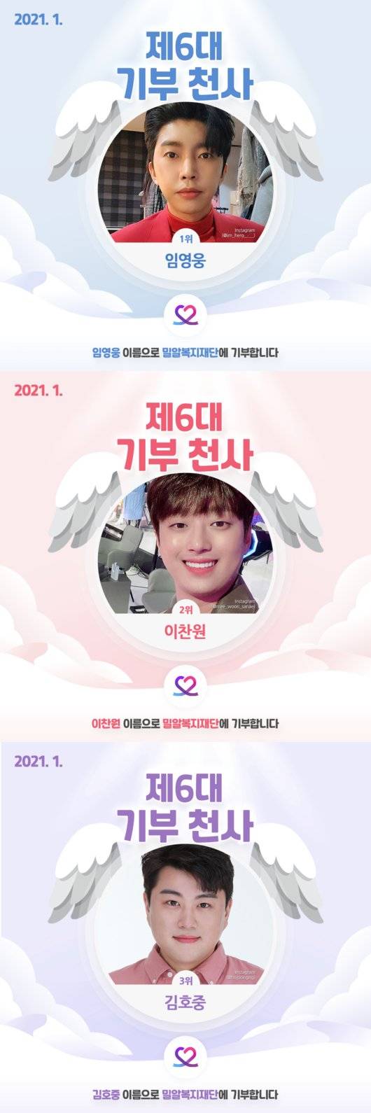 1월 기부천사로 선정된 임영웅, 이찬원, 김호중은 장애인 일자리 지원 사업을 후원하는 밀알복지재단에 총 150만 원을 기부할 예정이다. 또 신년을 맞아 제6대 기부천사부터는 지하철 CM보드 광고도 진행한다. 임영웅, 이찬원, 김호중의 광고는 1월 15일부터 고속터미널역에서 볼 수 있다.