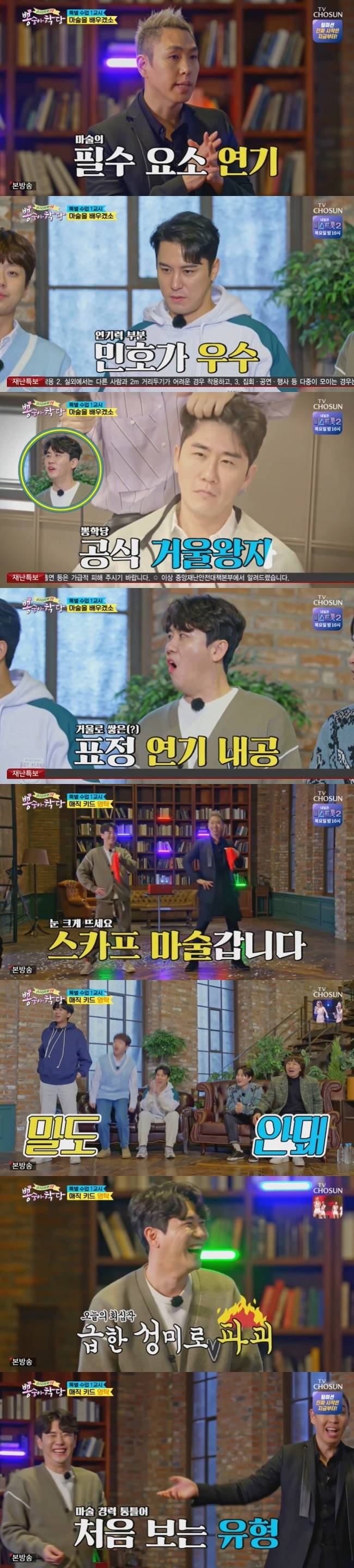 장민호 “선생님 마술을 그렇게 많이 봤는데, 도움 주시는 분이 머리로 달걀을 깨는 건 처음 본다”고 지적했고, 이은결도 "나도 처음이다"고 말해 웃음을 자아냈다. (사진=TV조선 '뽕숭아학당' 방송 캡처)