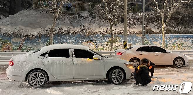 (서울=뉴스1) 김진환 기자 = 서울 전역에 대설주의보가 발효된 6일 오후 서울 관악구 호암로 인근 도로가 강설로 인해 결빙돼 차들이 멈춰서 있다.2020.1.6/뉴스1