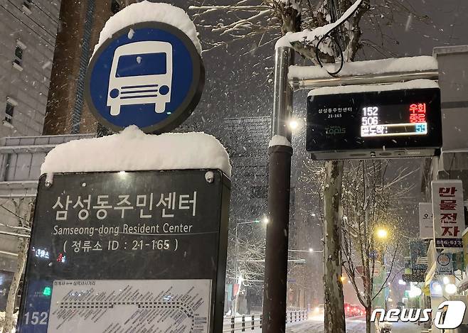 (서울=뉴스1) 김진환 기자 = 서울 전역에 대설주의보가 발효된 6일 오후 서울 관악구 호암로 인근 도로가 강설로 인해 결빙돼 버스정류장 안내에 우회한다는 문구가 표시되고 있다.2020.1.6/뉴스1