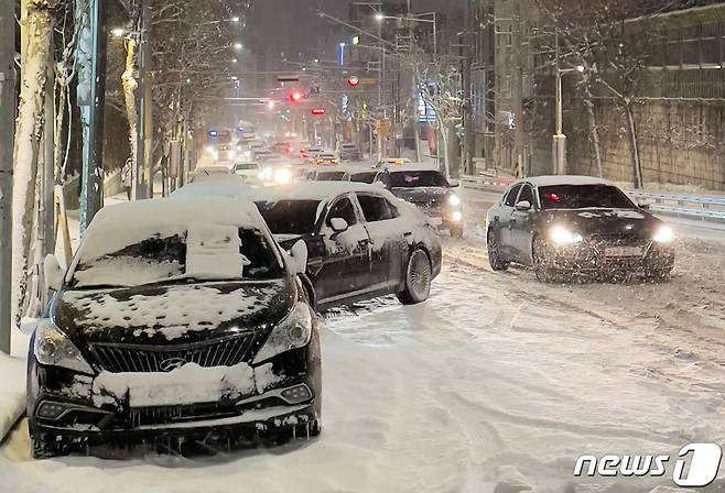 (서울=뉴스1) 김진환 기자 = 서울 전역에 대설주의보가 발효된 6일 오후 서울 관악구 호암로 인근 도로가 강설로 인해 결빙돼 차들이 멈춰서 있다. 2020.1.6/뉴스1