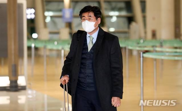 [인천공항=뉴시스]김선웅 기자 = 이란에 나포·억류된 한국 국적 선박과 선원들의 석방 문제 등을 협상할 고경석 외교부 아프리카중동국장 등 외교부 대표단이 6일 오후 인천국제공항을 통해 이란으로 출국하고 있다. 2021.01.06. mangusta@newsis.com