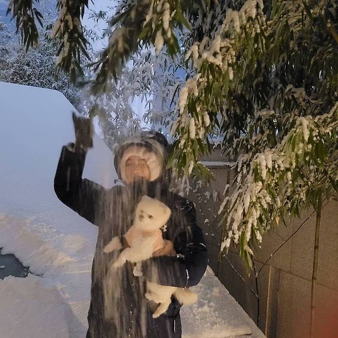 공개된 사진 속 성유리는 따뜻한 패딩을 갖춰 입고 반려견과 함께 눈 오는 풍경을 즐기고 있다.