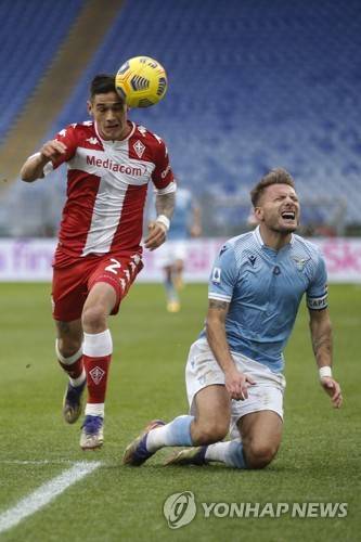 epa08922375 Fiorentina's Lucas Martinez Quarta (L) and Lazio's Ciro Immobile in action during the Italian Serie A soccer match between SS Lazio and ACF Fiorentina at the Olimpico stadium in Rome, Italy, 06 Jannuary 2021. EPA/FABIO FRUSTACI