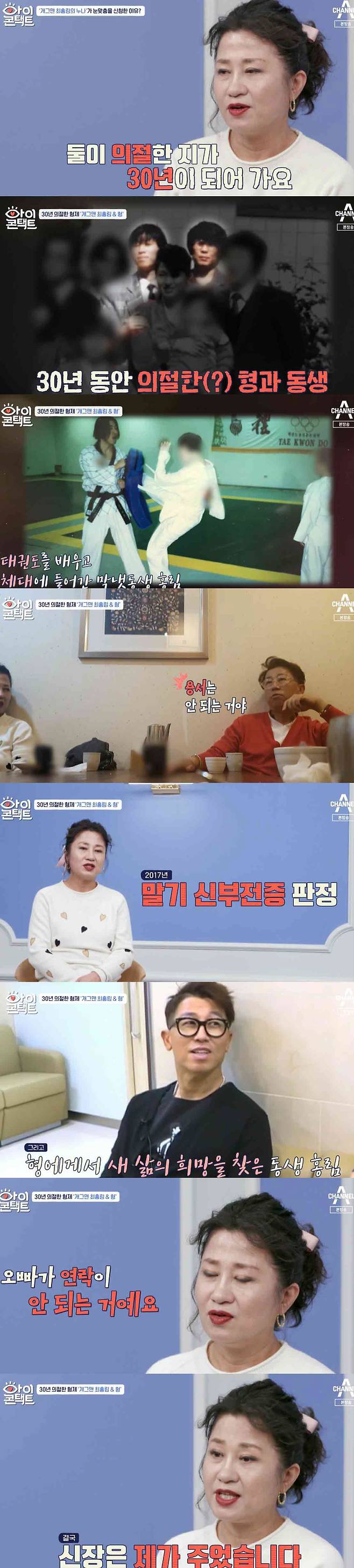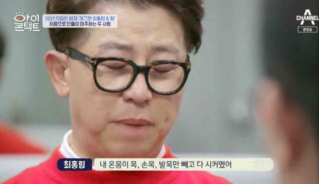 최홍림은 6일 방송한 채널A '아이콘택트'에 출연해 친형을 30년만에 만났다. 두 사람의 만남은 둘째 누나의 주선으로 이루어졌다.