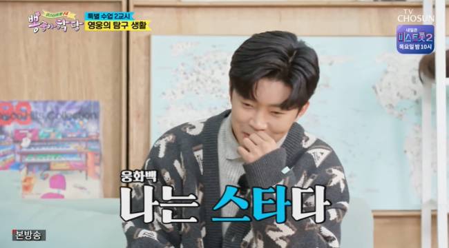 그림을 들고 상황실에 온 임영웅은 자신의 그림에 대해 “코로나로 어두운 시국에 밤하늘에 빛나는 별 같은 사람이고 싶다”고 설명했다. 박상희는 “본인을 생각했을 때 그냥 스타다. 2020년은 임영웅 씨의 해였는데 좋은 기회를 만난 것도 있지만 높은 자신감과 자존감으로 준비해 온 스타다. 본인의 정체성이 확실하다”고 평가했다. (사진=TV조선 '뽕숭아학당' 방송 캡처)