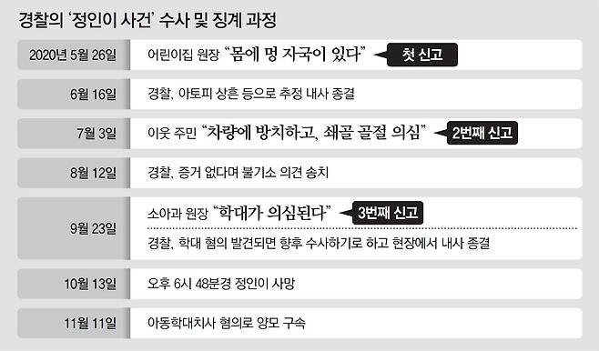 지난해 5월부터 9월까지 어린이집 원장과 이웃 주민, 소아과 원장 등은 정인이의 학대 징후를 발견하고 각각 신고했다. 하지만 경찰은 양부모에 대해 모두 내사 종결 또는 무혐의 처분해 정인이를 양부모와 분리할 수 있었던 기회를 놓쳤다.