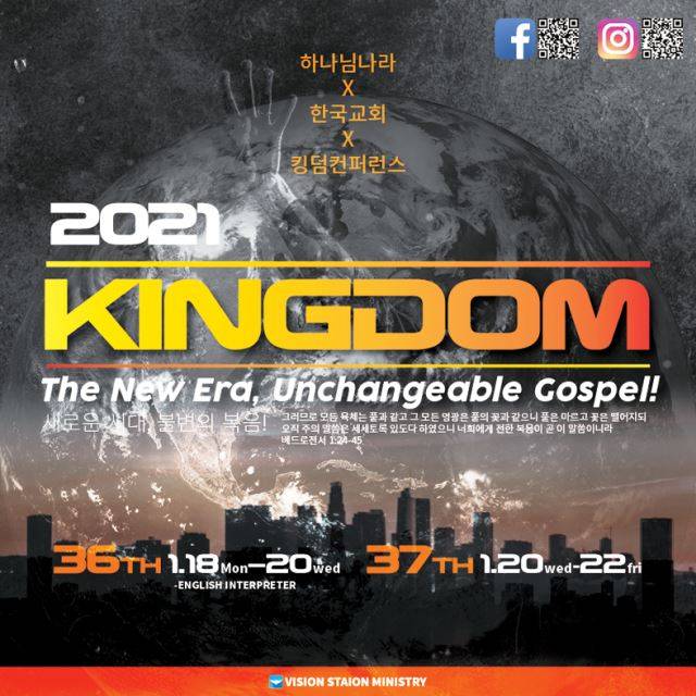 비전스테이션 미니스트리(대표 황성은 목사)는 오는 18~20일과 20~22일 제36, 37차 ‘2021 킹덤 콘퍼런스’(포스터)를 개최한다. 주제는 ‘새로운 시대, 불변의 복음’이고 화상회의 플랫폼 줌을 통해 진행된다. 주최 측은 초대교회 성도들이 지하 카타콤에서 예배했듯 오프라인 모임이 힘든 상황에서 이 시대를 깨우고 다음세대가 믿음으로 결단하도록 돕기 위해 이 행사를 기획했다고 밝혔다. 강사는 황성은 목사를 비롯해 폴 칠더스 국제YWAM 코나열방대 대표, 이영환(한밭제일교회 원로) 임현수(캐나다 큰빛교회 원로) 브라이언 박(순회설교자) 박한수(제자광성교회) 목사 등이다. 36차 콘퍼런스에선 모든 강사의 메시지가 동시통역된다.