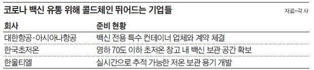 국내 콜드체인 기업들도 콜드체인 구축에 박차를 가하고 있다. 한국초저온은 국내에선 유일하게 영하 70도까지 온도를 유지할 수 있는 1751㎡(약 530평) 규모의 창고를 보유하고 있다. 액화천연가스(LNG)를 다시 기체 형태로 가공하는 과정에서 발생한 냉열을 이용해 초저온을 유지하는 방식이다. 이곳에 원래 신선 식품을 보관했지만 지난달 말 백신 보관을 대비해 창고를 비웠다.