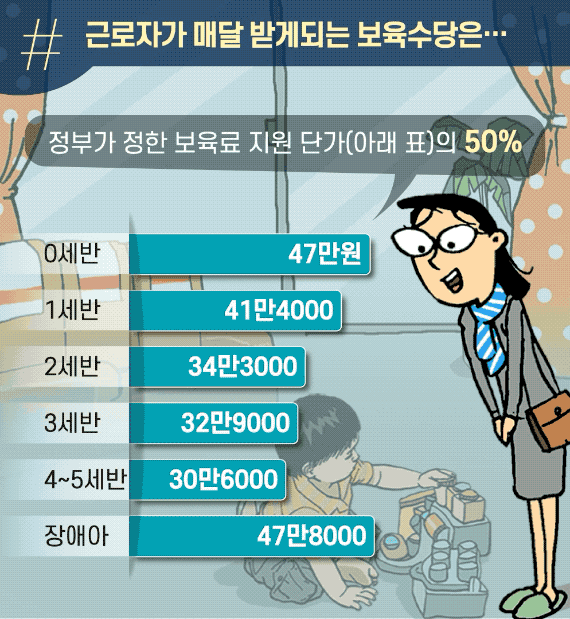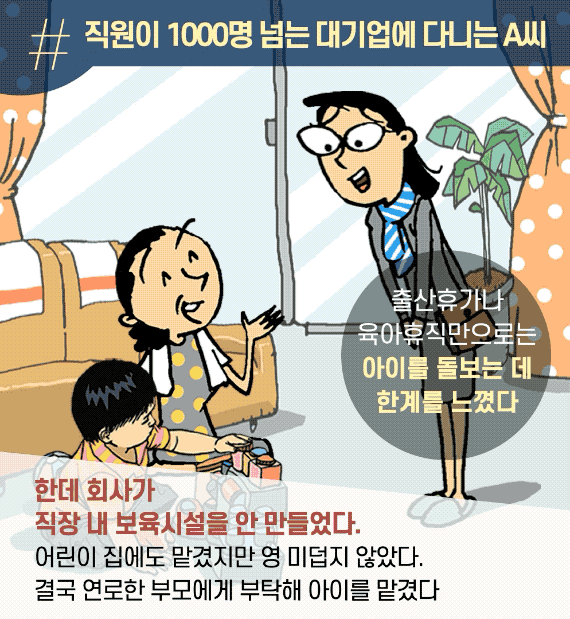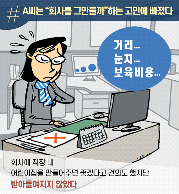 한데 비용을 아끼겠다며 보육시설을 안 갖춘 기업이 많다. 법 조항은 권고 수준이어서 단속 대상이 아니기에 마땅한 제재 방법도 없다. 근로자로선 답답할 노릇이다.