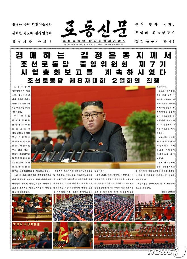 (평양 노동신문=뉴스1) = 북한 노동당 기관지 노동신문은 7일 1면에 제8차 노동당 대회 2일 차 회의 소식을 보도했다. 신문은 "1월6일 대회 2일 회의가 진행되었다"라며 "김정은 동지께서 1일 회의에 이어 당 중앙위원회 제7기 사업총화 보고를 계속하시었다"라고 전했다.