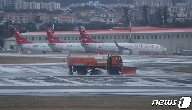 (제주=뉴스1) 오현지 기자 = 7일 오전 제주국제공항 활주로에서 제설 작업이 진행되고 있다.