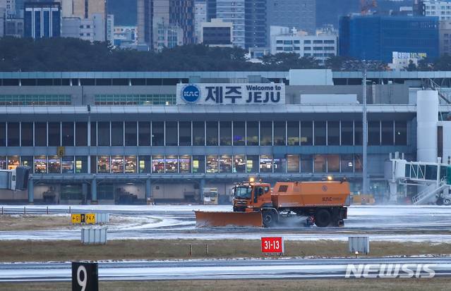 [제주=뉴시스]우장호 기자 = 대설특보가 내려지는 등 한파가 기승을 부리고 있는 7일 오전 제주국제공항 활주로에서 제설차가 눈을 치우고 있다. 현재 제주도는 모든 지역에 강풍·대설특보가 발효된 상태다. 2021.01.07. woo1223@newsis.com