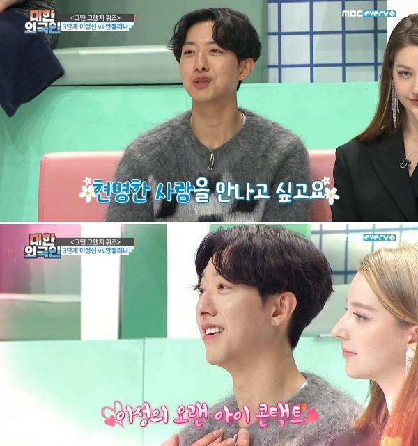 이어 이정신은 이성에 대한 자신의 '심쿵 포인트'를 밝히기도 했다. 그가 "여성 분께서 저를 오래 쳐다보시면 '심쿵' 한다"고 말하자 옆자리에 앉은 안젤리나는 이정신을 뚫어지게 쳐다봐 웃음을 안겼다.