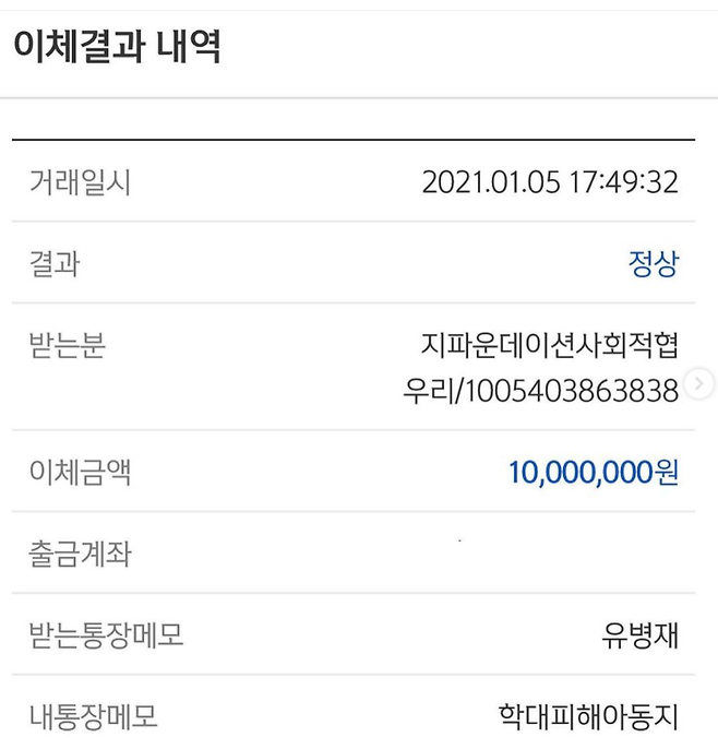 방송인 유병재가 6일 자신의 SNS를 통해 학대피해아동 지원캠페인 지파운데이션에 1000만원의 후원금을 보낸 명세서를 공개했다.