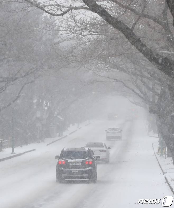 (제주=뉴스1) 오현지 기자 = 대설특보가 내려진 7일 오전 제주시 아라동 제주대학교에서 차량들이 서행하고 있다.