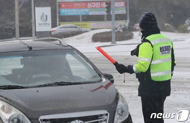(제주=뉴스1) 오현지 기자 = 대설특보가 내려진 7일 오전 제주시 아라동 제주대학교 앞 사거리에서 자치경찰이 차량통제를 하고 있다.