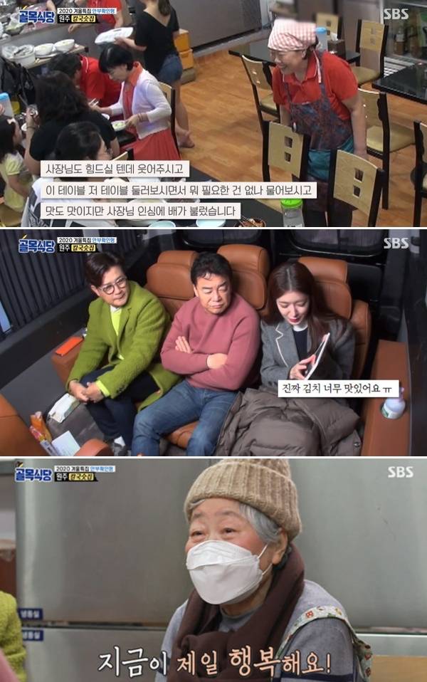 이날 원주 칼국숫집을 방문한 3MC는 칼국숫집으로 가는 차 안에서 손님들이 올려준 SNS 후기를 살펴봤다. 정인선은 "후기를 정말 많이 올려주셨다"며 여러가지 후기들을 읽어내려갔다. '사장님도 힘드실텐데 테이블을 둘러보시며 뭐 필요한 건 없나 물어보셨다. 맛도 맛이지만 사장님 인심에 배가 불렀다', '김치가 정말 맛있었다' 등의 글들이 감동을 선사했다.