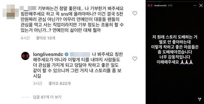 이 가운데 엉뚱한 곳에서 문제가 일어났다. 한 누리꾼이 쌈디의 행동을 '보여주기 식'이라고 비난하고 나선 것. 해당 누리꾼은 "나 기부한 거 봐주세요, 칭찬해주세요 하고 꼭 SNS에 올려야 하나? 이건 결국 5천만 원짜리 관심 아닌가? 아무리 연예인이 대중들 팬들의 관심을 먹고사는 직업이라지만 기부 정도는 조용히 할 수 있는 거 아닌가"라는 댓글을 남겼다.