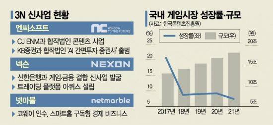 7일 게임업계에 따르면 엔씨는 사업 영역 확장에 가장 적극적이다. 엔씨는 '콘텐츠 강자' CJ ENM과 연내 합작법인(JV)을 설립할 예정이다. 엔씨의 IT와 CJ ENM의 엔터테인먼트 역량을 접목해 다양한 콘텐츠 사업을 펼친다는 구상이다. 우선 엔씨는 이달 중 출시 예정인 K팝 팬 플랫폼 '유니버스'를 위해 CJ ENM과 협력에 나서기로 했다. 엔씨의 영역 확장은 이번이 처음이 아니다. 지난해 10월엔 KB증권, 디셈버앤컴퍼니자산운용과 '인공지능(AI) 간편투자 증권사' 출범을 위한 JV 설립에도 참여했다. 3사는 엔씨의 AI 기술, KB증권의 금융투자 노하우를 융합해 새로운 형태의 디지털 증권사를 만든다. 엔씨는 자신들의 강점인 IT 기술의 영향력을 게임 외 다른 분야로 점차 넓힐 계획이다. 엔씨 관계자는 "엔씨가 20년 넘게 연구한 기술들이 적용되는 범위를 넓히는 도전을 계속하고 있다"고 설명했다.